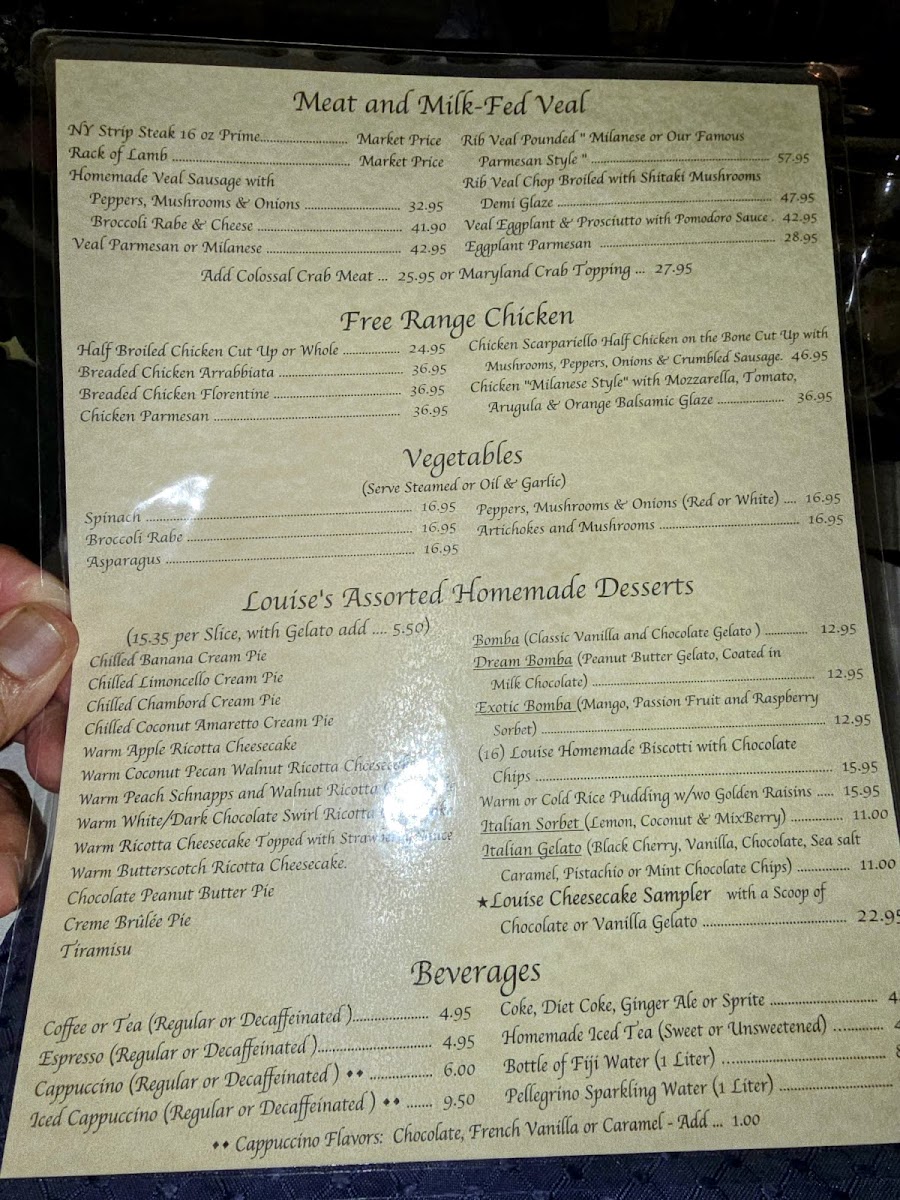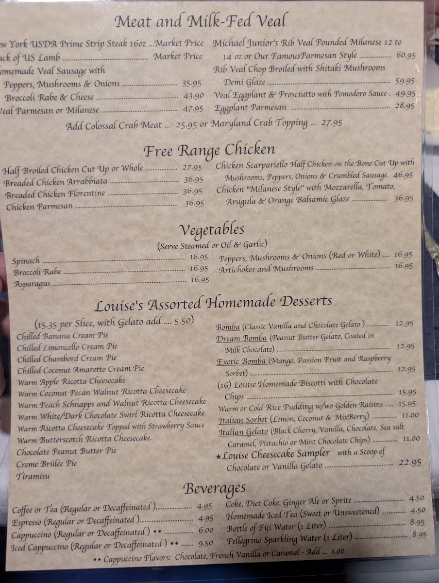 You’ll find a variety of dishes perfect for a leisurely dinner, from traditional favorites like Milk Fed Veal Parmigiana and Chicken Florentine to fresh seafood options such as Chilean Sea Bass with Tequila Honey Glaze and Salmon with Crab Meat. The Pasta Trio and homemade soups lend a cozy, familiar touch, making them ideal for sharing or a quiet evening meal.